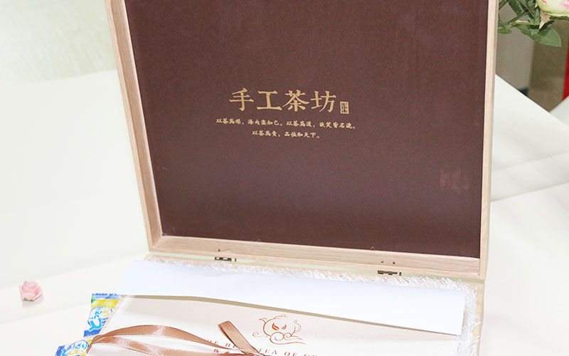 1.材質:茶葉包裝盒定制盒子中心用特種紙熱壓紋路,無印刷,直接燙金産品名字激凸,标志燙紅金,地址信息燙黃金,盒子正中心貼一個産品代表圖案,盒子外框制作5MM厚度的木質材料.盒子内部結構上盒貼特種紙燙金文字,下盒内托0.5MM厚度上面鋪上進口高檔寶白色絨布,絨布上面放一張白色特種紙文字燙金,蓋一層紙能讓産品更有一種神秘感。盒型爲翻蓋盒,盒子的翻蓋地方上一個自動的小鎖扣,顯得更加漂亮精緻整款盒子手工制作精細,紙張和木質結合更加環保。