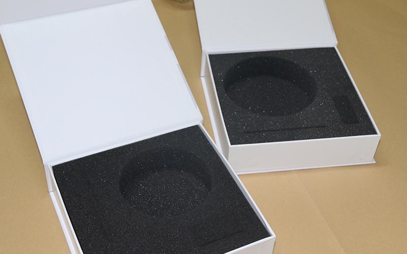 1.材質:盒子外殼用157G銅版紙單面彩色印刷,裱1500G雙灰闆,盒子表面不需要特殊工藝,盒型爲翻蓋盒,内托用44密度的黑色海綿。整款盒子簡單好做,都是上機器制作。