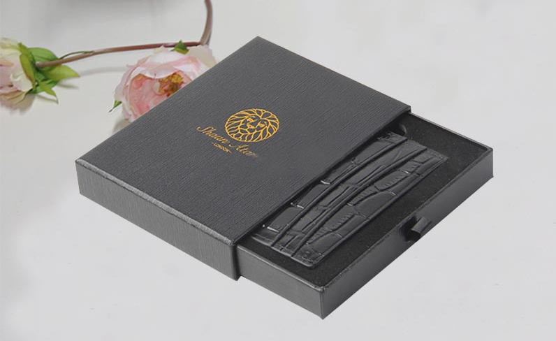 1.材質:盒子面紙用盒子有紋理的特種紙,表面LOGO燙香槟金,裱1300G雙灰闆,盒子内托用黑色EVA植黑色絨,盒型爲抽屜盒裝一個黑色的小絲帶方便抽拉,整款盒子外盒手工制作,内盒上機生産。